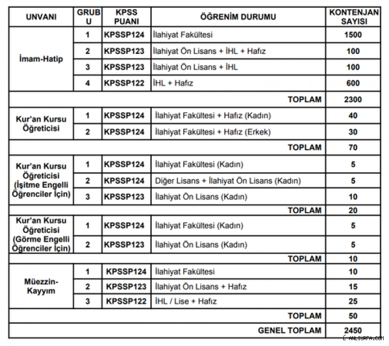 Diyanet İşleri Başkanlığı personel alımı yapılacağını açıkladı. Açıklamaya göre, taşra teşkilatında istihdam edilmek üzere toplam 2 bin 450 personel alınacak. Personel alımı yapılacak bölümler şu şekilde:Konuya ilişkin açıklama ise şu şekilde: "Diyanet İşleri Başkanlığımız Taşra Teşkilatında münhal bulunan 4/B sözleşmeli pozisyonlarda istihdam edilmek amacıyla 2022 yılı Kamu Personel Seçme Sınavı (KPSS) B grubu puan sırası esas alınarak ilan edilen boş pozisyonların üç katı kadar aday arasından Başkanlıkça yapılacak sözlü sınav sonucuna göre Diyanet Akademisine aday din görevlisi (Kur’an kursu öğreticisi, imam-hatip ve müezzin-kayyım) alımı yapılacaktır"
