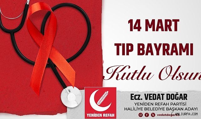 Yeniden Refah Partisi Haliliye Belediye Başkan adayı Ecz. Vedat Doğar, 14 Mart Tıp Bayramı dolayısıyla bir mesaj yayımladı. Doğar, sağlık çalışanlarının özverili çabalarını takdir ederken, sağlık ve refahın toplumun önemli bir parçası olduğunu vurguladı.