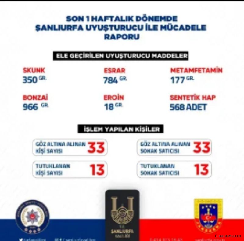 Şanlıurfa Valisi Hasan Şıldak, uyuşturucu ile mücadele kapsamında yapılan çalışmalara ilişkin açıklama yaptı.Sosyal medya üzerinden haftalık verileri paylaşan Vali Şıldak, toplamda 33 kişinin gözaltına alındığını, bunlardan 13’ünün tutuklandığını ifade etti. Gözaltına alınan sokak satıcısı sayısının 33 olduğunu dile getiren Vali Şıldak, 13 sokak satıcısının tutuklandığını kaydetti.Şıldak çalışmalarda; 350 gram skunk, 784 gram esrar, 177 gram metamfetamin, 966 gram bonzai, 18 gram eroin ve 568 adet sentetik hap ele geçirildi.