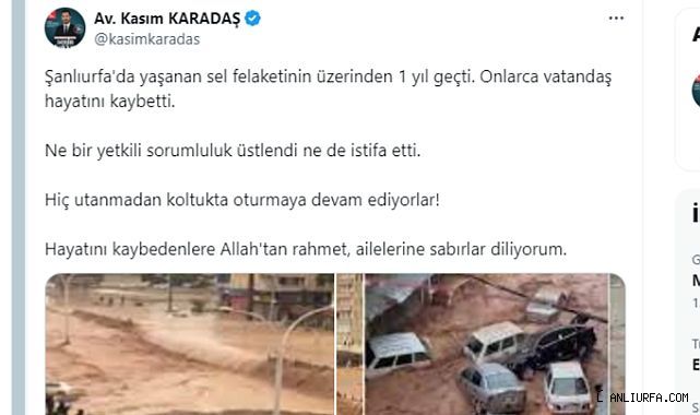 "Şanlıurfa'da yaşanan sel felaketinin üzerinden 1 yıl geçti. Onlarca vatandaş hayatını kaybetti. Ne bir yetkili sorumluluk üstlendi ne de istifa etti. Hiç utanmadan koltukta oturmaya devam ediyorlar! Hayatını kaybedenlere Allah'tan rahmet, ailelerine sabırlar diliyorum." Karadaş'ın sözleri, sel felaketi sonrası yaşanan öfke ve hayal kırıklığını bir kez daha gözler önüne seriyor.