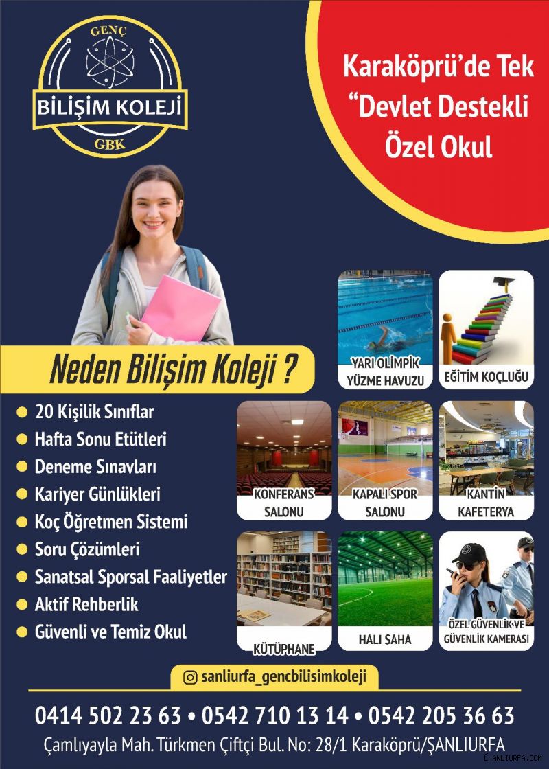 Şanlıurfa’nın Karaköprü ilçesinde eğitim dünyasına yepyeni bir soluk getiren Genç Bilişim Koleji, bölgenin tek devlet destekli özel okulu olarak öğrenciler ve veliler için büyük bir fırsat sunuyor.Devlet desteği sayesinde öğrenciler, özel okul kalitesinde eğitim alma şansını yakalarken aynı zamanda mesleki bölüm derslerini de uygulamalı bir şekilde öğreniyor. Bu model, gençlerin hem akademik başarılarını yükseltmeyi hem de hayata donanımlı bir şekilde hazırlanmalarını hedefliyor.Akademik Başarıya Katkı Sağlayan ProgramlarGenç Bilişim Koleji, öğrencilerin akademik gelişimini desteklemek için deneme sınavları, yaprak testler, hafta sonu etütleri, birebir dersler ve soru çözüm saatleri düzenliyor. Bu sistemli yaklaşım, öğrencilerin sınavlara daha güçlü hazırlanmasına olanak tanıyor.Sosyal ve Kültürel Etkinliklerle Fark YaratıyorKurum, akademik eğitimin yanı sıra sosyal ve kültürel etkinliklerle de öğrencilerin gelişimine katkıda bulunuyor. Kariyer günleri, şehir içi ve şehir dışı geziler, kurum ziyaretleri, spor ve sanat faaliyetleri, yüzme kursları ve konferans salonunda düzenlenen etkinliklerle öğrenciler hem eğleniyor hem de yeni ufuklar kazanıyor.Donanımlı Kadro ve Modern Eğitim OrtamıDeneyimli öğretmen kadrosu ve güçlü akademik programıyla dikkat çeken Genç Bilişim Koleji, modern eğitim ortamında yabancı dil programlarıyla da öğrencilere uluslararası vizyon kazandırıyor. Bu yönüyle sadece akademik değil, sosyal anlamda da öğrencilerin hayata en iyi şekilde hazırlanmasını sağlıyor.“Kaliteli Eğitim Herkes İçin Erişilebilir”Şanlıurfa Karaköprü’de tek devlet destekli özel okul olan Genç Bilişim Koleji, “Kaliteli eğitimi herkes için erişilebilir kılmak” vizyonuyla eğitimde fırsat eşitliğini hayata geçiriyor.Adres: Şanlıurfa Karaköprü – Genç Bilişim Kolejiİletişim ve Kayıt: 0542 205 3663