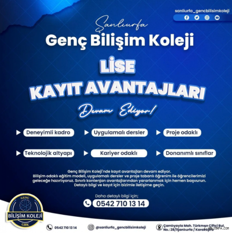 Şanlıurfa’nın Karaköprü ilçesinde eğitim dünyasına yepyeni bir soluk getiren Genç Bilişim Koleji, bölgenin tek devlet destekli özel okulu olarak öğrenciler ve veliler için büyük bir fırsat sunuyor.