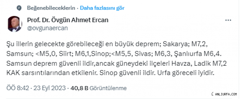 İstanbul Teknik Üniversitesi (İTÜ) Öğretim Üyesi ve Jeofizik Uzmanı Prof. Dr. Ahmet Ercan, bazı illerin gelecekte görebileceği en büyük deprem büyüklüklerine ilişkin verileri sosyal medya hesabından paylaştı. Şanlıurfa’nın göreceli iyi olduğunu kaydeden Ercan, kentin gelecekte görebileceği en büyük depremin 6.4 büyüklüğünde olabileceğini öne sürdü. Ercan paylaşımında şunları ifade etti: “Şu illerin gelecekte görebileceği en büyük deprem; Sakarya; M7,2, Samsun;