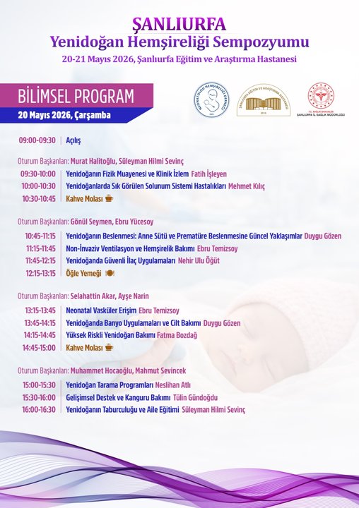 Şanlıurfa İl Sağlık Müdürlüğü koordinasyonunda, Şanlıurfa Eğitim ve Araştırma Hastanesi ile Neonatoloji Hemşireliği Derneği iş birliğiyle 'Şanlıurfa Yenidoğan Hemşireliği Sempozyumu' düzenlenecek. Etkinlik, 20-21 Mayıs 2026 tarihleri arasında Şanlıurfa Eğitim ve Araştırma Hastanesi'nde gerçekleştirilecek.Sempozyumun temel amacı, yenidoğan hemşireliği alanında çalışan sağlık personelinin bilgi ve deneyimlerini artırmak, mesleki farkındalığı güçlendirmek ve alandaki güncel gelişmeleri paylaşmaktır. Bu önemli buluşma, yenidoğan bakımındaki en son yeniliklerin tartışılmasına olanak tanıyacak.